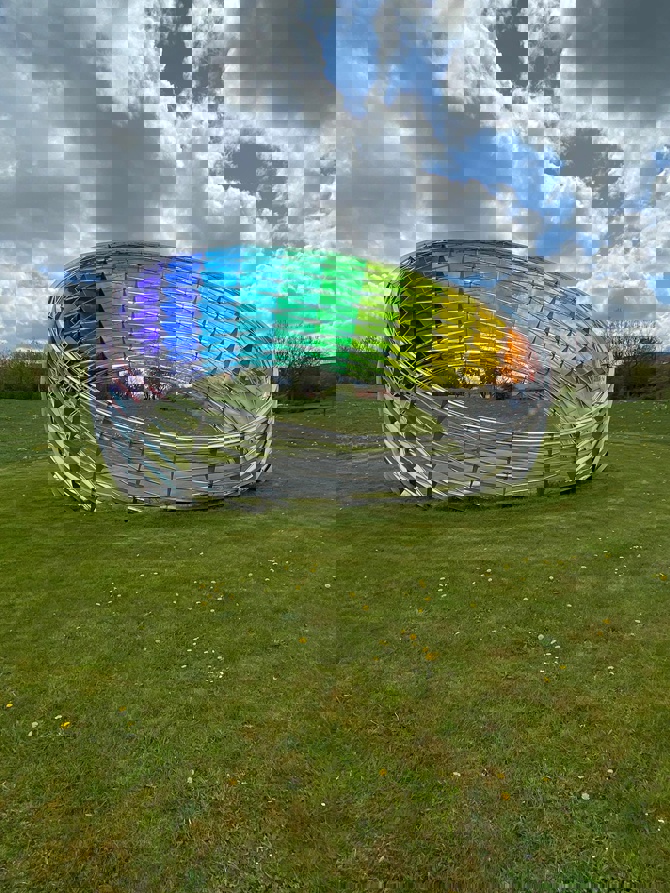 Daylight Pavilion stands at the heart of Campus LKR. It is five meters high and eight meters in diameter. The sculpture, made of stainless steel, features bands of coloured glass in all the hues of the rainbow. It is the work of the internationally renowned Danish-Icelandic artist Olafur Eliasson. Daylight Pavilion was unveiled on December 21, 2007.