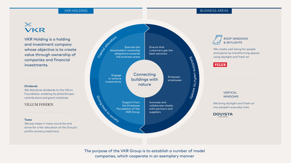 Our two business areas — roof windows and skylights, and vertical windows — provide a solid base for sustained growth and value creation. Through our flagship companies, VELUX and DOVISTA, we drive financial value by maintaining market leadership and focusing on innovation and operational excellence.