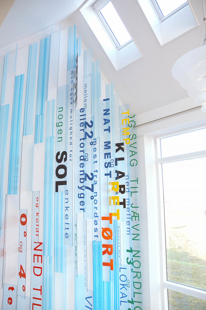 The central idea of the decoration is to visualize VKR-Holding’s mission to “bring daylight, fresh air, outlook and solar energy into the everyday lives of people.” In order to underline the company’s history, the mission of the VKR-group and to accentuate the site-specific space with a view to the vast and open sky vista outside, I have chosen to create an artistic re-adaptation of the two weather reports, one on the day the company was founded, April 1, 1941 and the other on the day the new headquarters in Hørsholm was inaugurated, August 1, 2007.